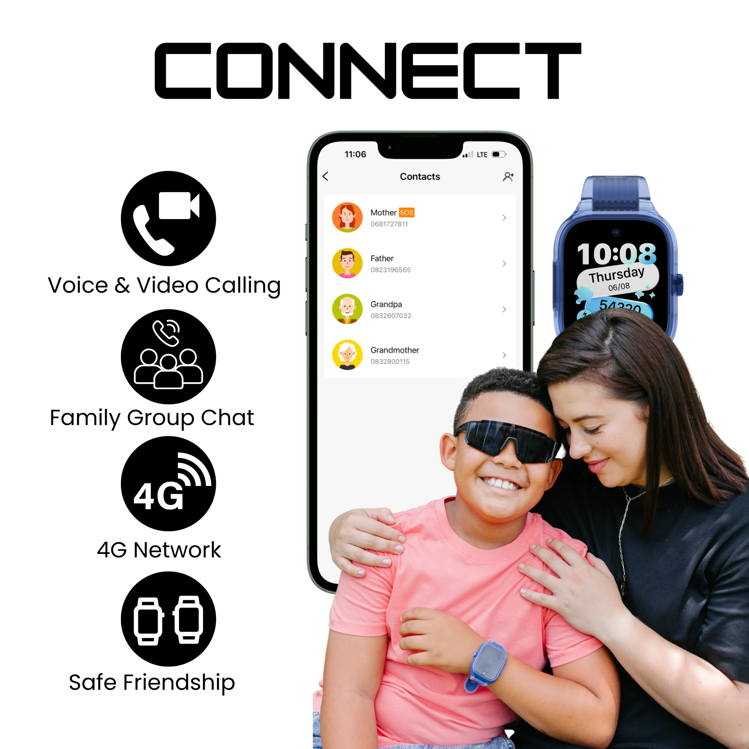 You stay in charge. Add trusted contacts, block strangers, set reminders, and manage the watch from your phone. No social media, no distractions — just a simple, safe way to keep your child connected without handing them a smartphone.